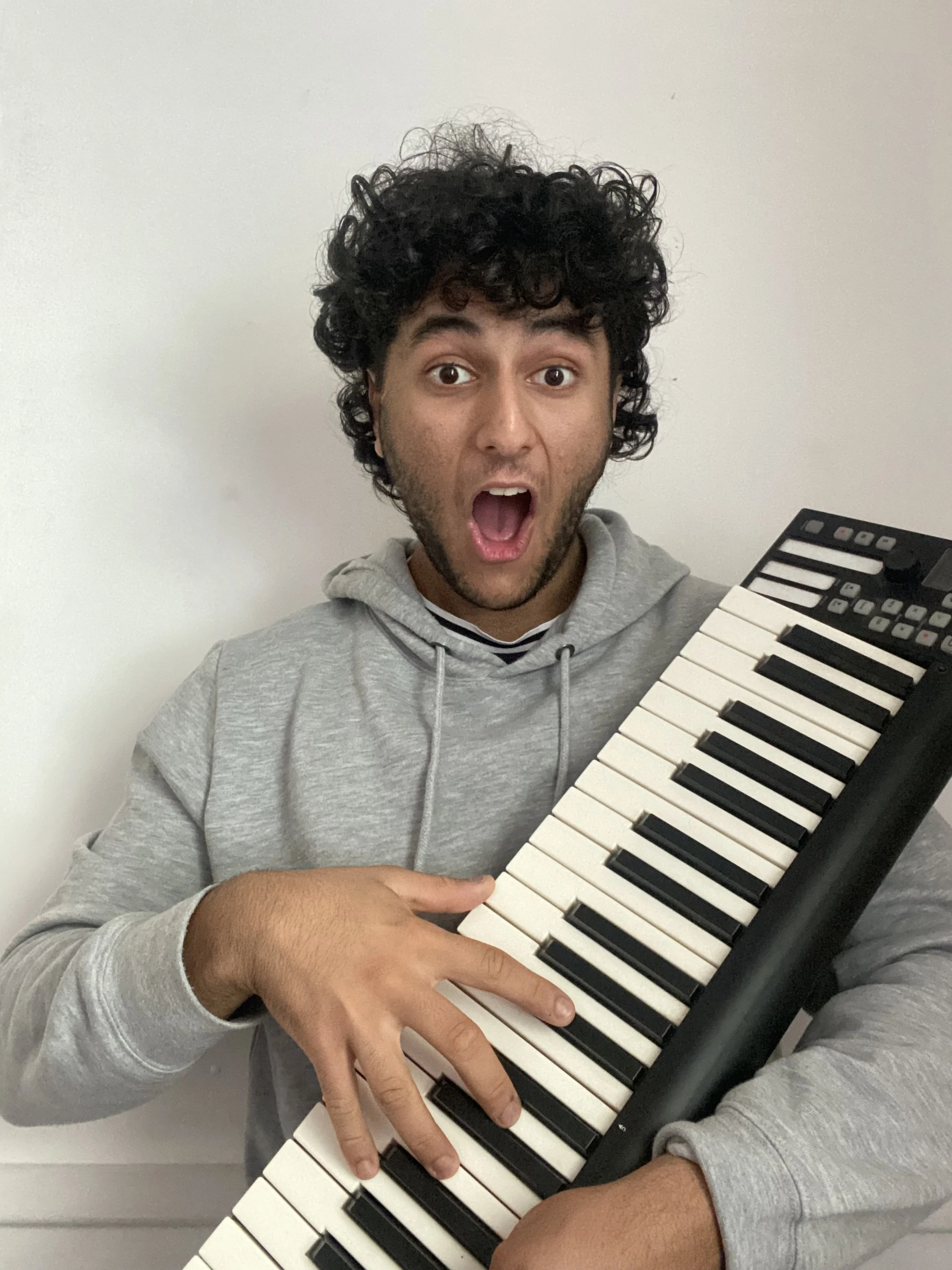 A man with curly black hair and light brown skin holding a small keyboard piano with an expression of surprise or excitement.